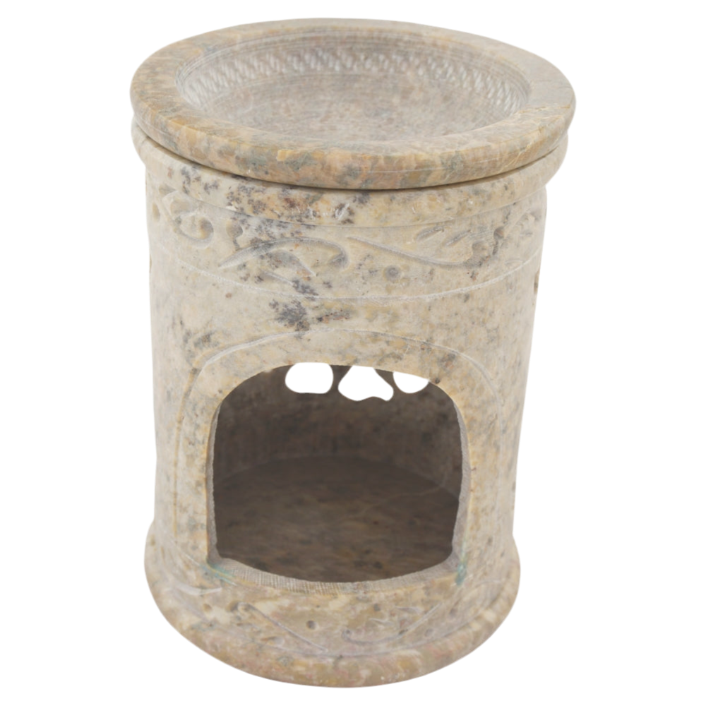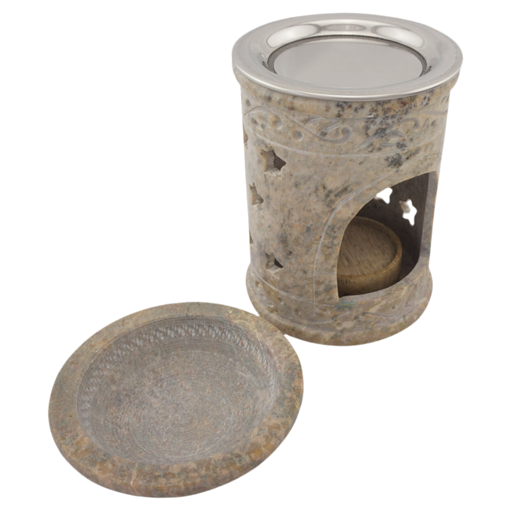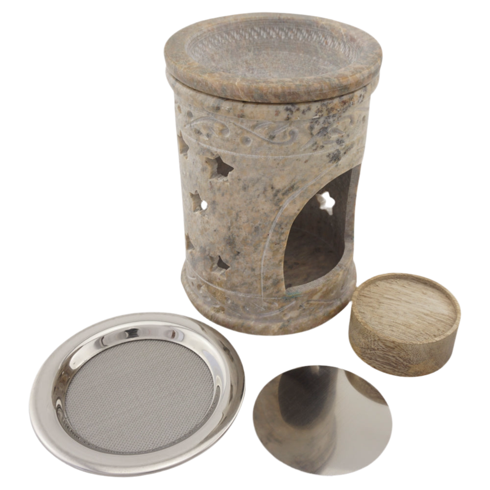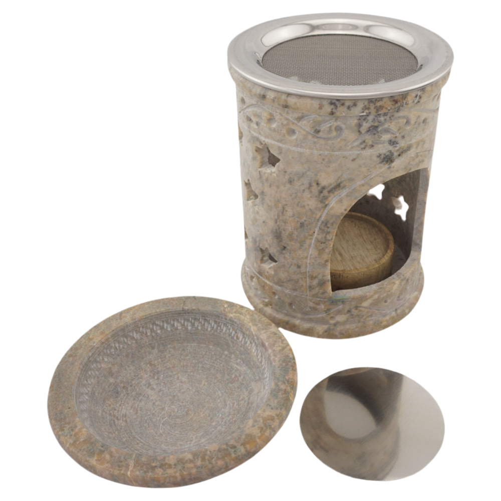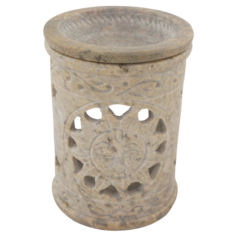 Duftlampe & Räucherstövchen „Sonne“ aus Speckstein – Mit Schale, Edelstahlsieb, Metallscheibe & Podest