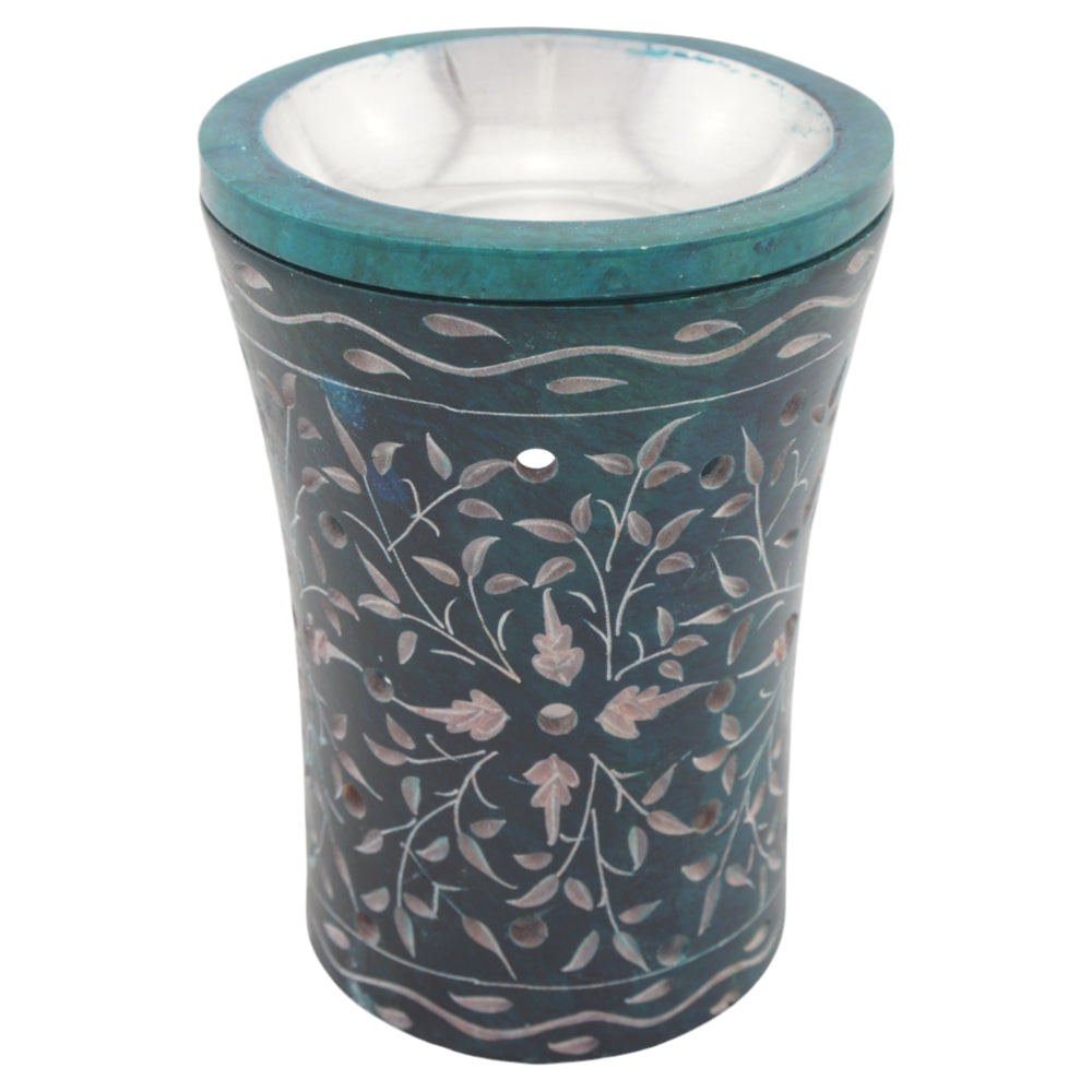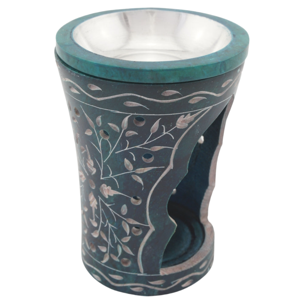 Diese handgefertigte Duftlampe & Räucherstövchen vereint edlen grünlich marmorierten Speckstein mit filigranen Mustern und bietet dir ein einzigartiges Räuchererlebnis – sei es mit ätherischen Ölen oder Weihrauch.