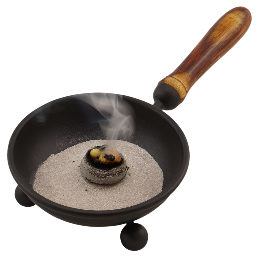 Ergänze deine Räucherpfanne mit hochwertiger Räucherkohle, feinem Räuchersand & einer praktischen Räucherzange.