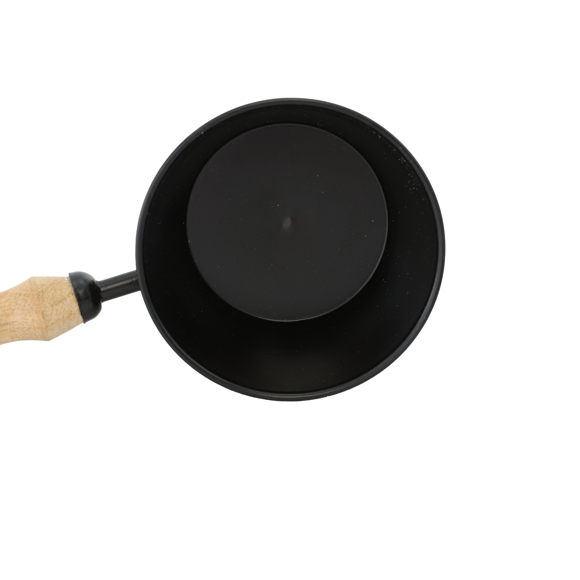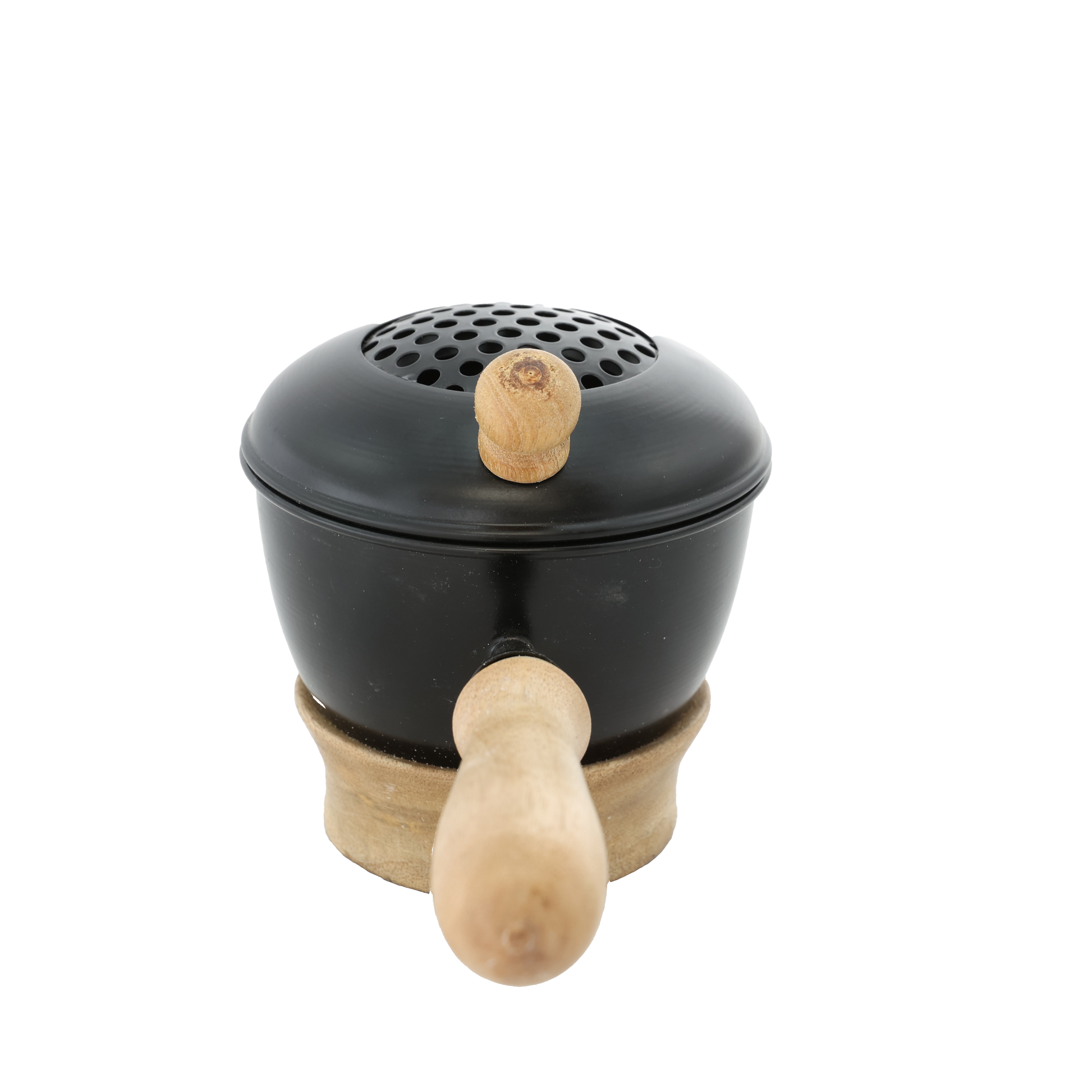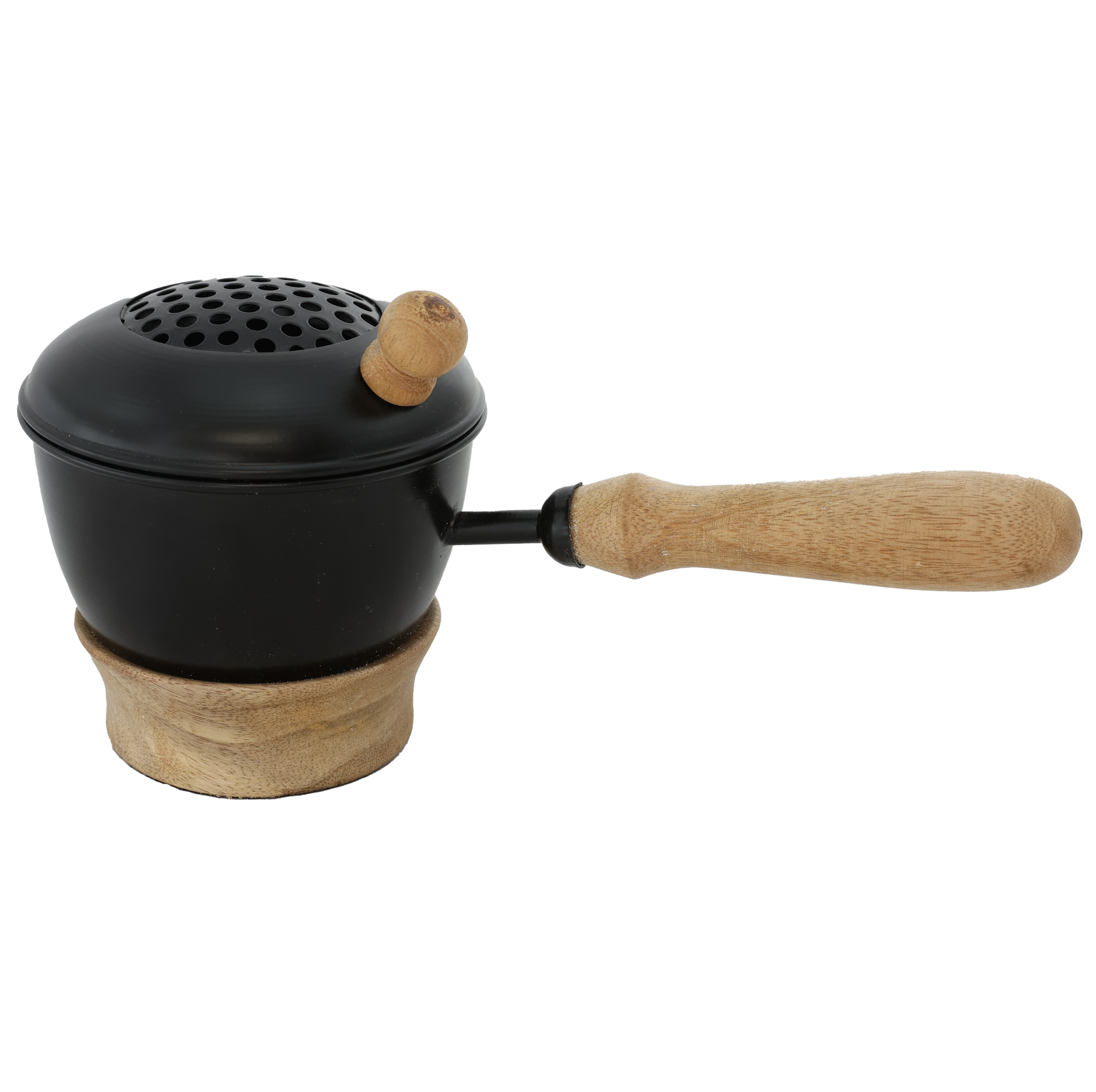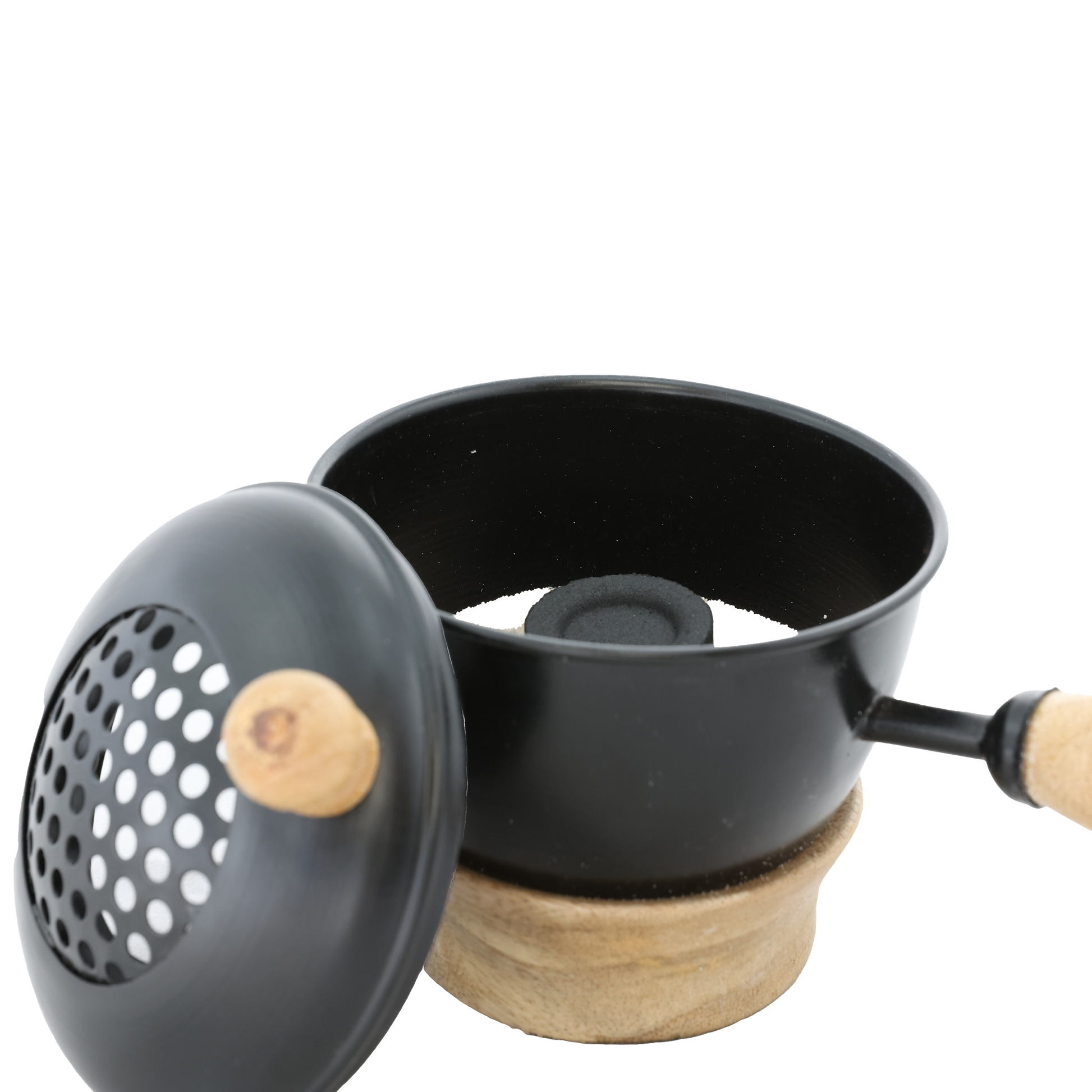 Die Metallschale mit einem Durchmesser von 11 cm sorgt für eine gleichmäßige Hitzeverteilung. Der stabile Holzsockel bietet einen sicheren Stand, sodass du die Pfanne auch stationär nutzen kannst – perfekt für längere Räucherzeremonien.