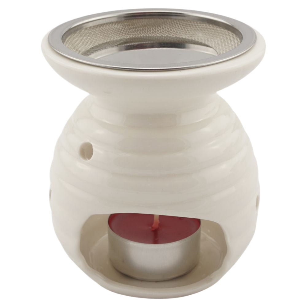 Das Stövchen ist mit einem Edelstahlsieb ausgestattet, das sich dank einer praktischen Kerbe im Rand leicht entnehmen lässt. Für empfindliche Räucherstoffe und flüssig werdende Harze liegt eine passende Metallscheibe bei, die das Sieb schützt.