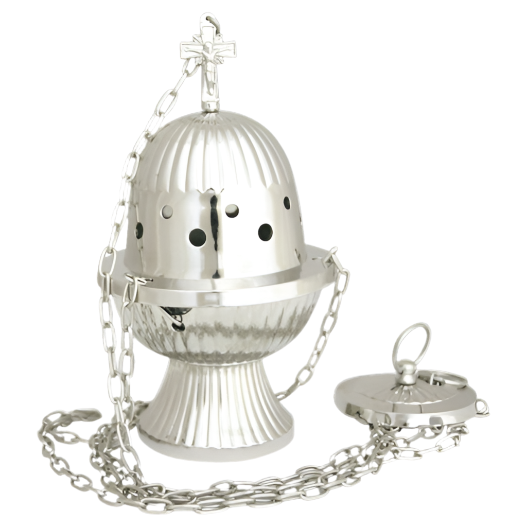 Ein Weihrauchfass, das Licht & Spiritualität vereint – Die edel vernickelte Oberfläche und das einzigartige Strahlen-Design machen dieses Weihrauchfass zu einem besonderen Kunstwerk für heilige Rituale. Die vertikal verlaufenden Strahlen strahlen eine symbolische Erhabenheit aus, während die Kreuz-Rauchöffnungen den duftenden Weihrauchnebel sanft aufsteigen lassen.